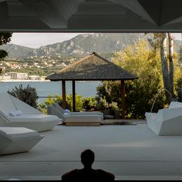 Débarrassée des pensées négatives et des nœuds en tout genre, on prolonge ces bienfaits en se promenant en peignoir et maillot de bain, dans le reste de l’établissement. La décoration semble être tournée vers l’extérieur. Le mobilier minimaliste, le sol immaculé et les murs boisés en forme de vagues nous dirigent automatiquement vers les ouvertures. La terrasse principale, accolée au bar, dessert un jardin paysagé à trois niveaux, doté de trois piscines, dont une à débordement. Et cette délicieuse perspective continue tout le long d’un escalier en pierre, bordé d’herbes aromatiques, de pins parasols et de roses odorantes. Destination finale ? Une plage privée, où le bleu de la mer rivalise avec celui du ciel. On s’y enivre des embruns marins et on lézarde au soleil toute la sainte journée pour faire le plein de vitamine D.
