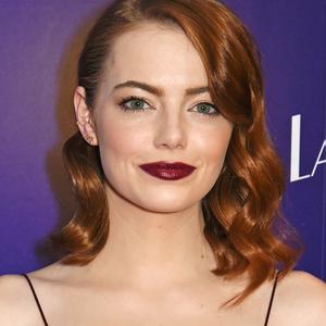 Emma Stone et son rouge grenat assorti à sa robe lors d’une projection de La La Land à Londres, le 12 janvier 2017.