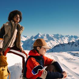 Anastasia : sous le pull en laine, Eric Bombard, veste Haglöfs, pantalon, We11done. Casquette, moonboots Chloé. boucle d’oreille, pochette Utility, masque porté sur le bras et chaussures, l’ensemble Louis Vuitton.