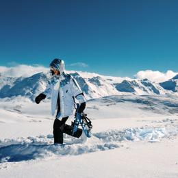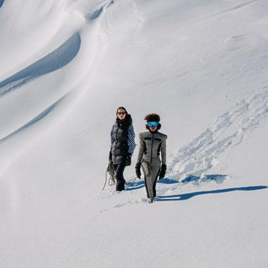 Anastasia : veste et pantalon de ski en matière technique, pull, lunettes, masque porté sur le bras, moufles et boots, l’ensemble Louis Vuitton. Raquettes personnelles.