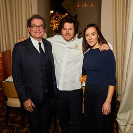 Bruno Moinard et Claire Bétaille, directeurs associés Moinard Bétaille, Jean Imbert, chef cuisinier. (Dîner d’anniversaire de l’agence Moinard Bétaille, Paris, le 24 novembre 2021.)
