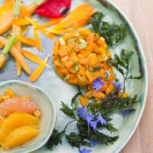 L’astuce du chef : vous pouvez ajouter à la purée de carottes un coulis d’agrumes et décorer les assiettes.