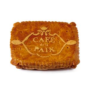 Feuilletage caramélisé au sirop d’érable en forme de Petit Beurre, frangipane noix de cajou. Café de la Paix, 6 parts, 55 €.