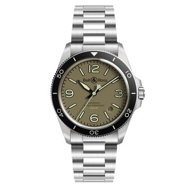 Montre BRV2-92 Military Green, 41mm, mouvement automatique, fonctions date et petite seconde. Boîtier et bracelet en acier, cadran vert, Bell & Ross, 2990 €. Disponible sur Bellross.com