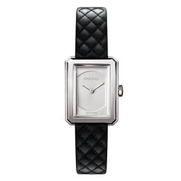 Montre Boy.Friend moyen modèle, mouvement quartz, boîtier en acier, lunette sertie de diamants, bracelet matelassé, Chanel, 3700 €. Disponible sur Chanel.com