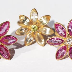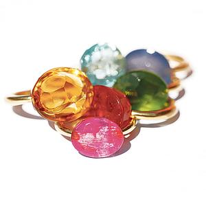 J’aimais beaucoup la mode épurée de Jil Sander, de Miu Miu. Et il n’y avait pas d’équivalent en bijoux, sauf peut-être Jean Dinh Van en France et Elsa Peretti aux États-Unis qui ne travaillaient pas les gemmes de couleur. À cette époque, seules les quatre pierres précieuses – diamants, rubis, émeraudes et saphirs – étaient considérées, et elles étaient toujours montées de façon très classique. Moi, je ne voulais pas porter et fabriquer des bijoux qui ressemblent à ceux de ma grand-mère. En Inde, tout était possible, et l’offre des pierres et des tailles était très vaste. Je voulais donner accès à ce monde méconnu. J’ai demandé à Munnu de tailler en briolettes (gouttes facettées, NDLR) des tourmalines, ce qui ne se faisait pas en Europe. Personne n’avait une approche de la pierre aussi désinvolte, gaie. Ça a très bien marché au Japon qui n’a pas de tradition du bijou. Mes bagues, bracelets et boucles d’oreilles étaient, et restent, imaginés par une femme pour des femmes, qui se les achètent elles-mêmes – ce qui était très nouveau alors – à l’opposé des bijoux que les hommes offrent pour montrer leur réussite sociale.