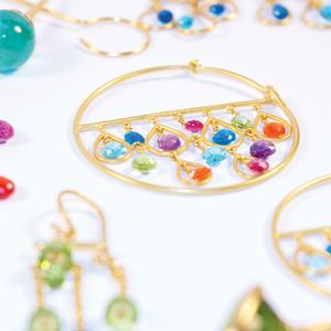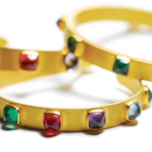 De notre envoyée spéciale à Jaipur. Elle nous reçoit là où tout a commencé, en 1996, dans un atelier du Gem Palace à Jaipur. C’est dans ce lieu mythique, qui fournit depuis plus d’un siècle et demi les maharajahs et les grandes familles indiennes en parures extravagantes, qu’elle chahute alors une joaillerie parisienne un brin compassée. Elle y fait fabriquer ses bijoux aux mille couleurs, sertis de pierres dites « semi-précieuses » (expression désormais interdite par la loi), d’une gaieté envoûtante. Ses bagues XL en tourmalines, ses boucles d’oreilles et colliers sertis de briolettes multicolores, ses joncs en or brossé piqués de rubellites ou de spinelles ont leurs inconditionnelles à Paris, New York et Tokyo. Cette voyageuse, qui a grandi à Tripoli puis au Liban et en Syrie au gré des affectations d’un père travaillant dans le pétrole, partage aujourd’hui sa vie entre Paris et Jaipur et chérit sa liberté et son indépendance. Entretien à sa table de travail couverte de pierres vibrantes.