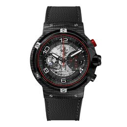 Montre Classic Fusion Ferrari GT 3D Carbon, 45mm, mouvement automatique avec chronographe Flyback. Boîtier en fibre de carbone 3D, lunette en céramique noire et bracelet en caoutchouc noir, Hublot, prix sur demande. Renseignements sur Hublot.com