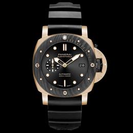Montre Submersible Goldtech Orocarbo, 44mm, mouvement automatique, fonctions date et petite seconde. Boîtier en Goldtech, bracelet en caoutchouc noir, Panerai, prix sur demande. Renseignements sur Panerai.com