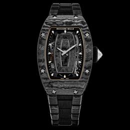 Montre RM 07-01, mouvement automatique squeletté, boîtier en céramique noire et carbone TPT, bracelet en carbone TPT, Richard Mille, prix sur demande. Renseignements sur Richardmille.com