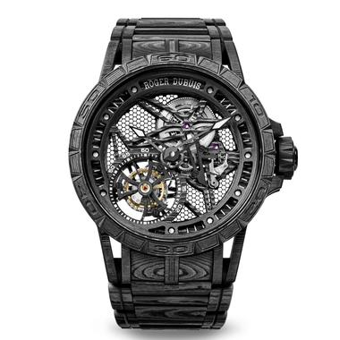 Montre Excalibur Spider Carbon, 45mm, mouvement tourbillon volant, boîtier et bracelet en carbone, Roger Dubuis, prix sur demande. Limitée à 28 pièces. Renseignements sur Rogerdubuis.com