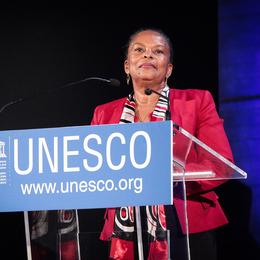 Icône noire française, Christiane Taubira est à l’origine d’une loi de 2001, qui reconnaît la traite et l’esclavage comme des crimes contre l’humanité. En septembre 2014, elle intervient à l’Unesco lors du 20e anniversaire du projet La Route de l’esclave. (Paris, le 10 septembre 2014.)