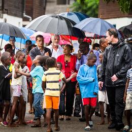 Militante indépendantiste, Christiane Taubira commence sa carrière politique au sein du Mouvement guyanais de décolonisation (MOGUYDE) créé par celui qui deviendra son mari, Roland Delannon, et père de ses 4 enfants. (Visite du quartier de Saramaka à Kourou, Guyane, le 21 février 2013.)