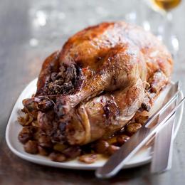 Une dinde haute coutûre, farcie au foie gras, aux châtaignes, à l’échalotes et aux cerneaux de noix.