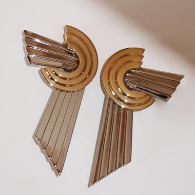 Boucles d’oreilles Meryl en métal doré et argenté, Leda Madera, 340 €. Disponible sur Ledamadera.com