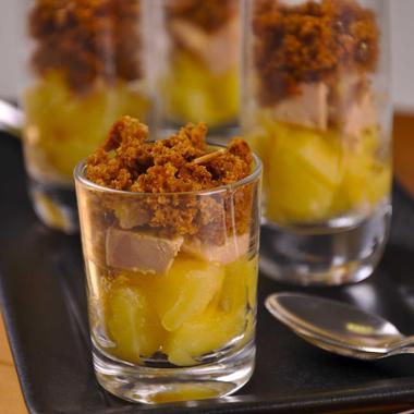 Voir la recette des verrines de pommes et foie gras en crumble de pain d’épices.