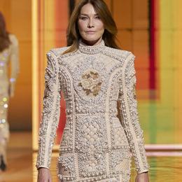 Carla Bruni-Sarkory dans une robe signature Balmain ornée de perles et de broderies florales pour le défilé Printemps-Été 2022 de Balmain. (Paris, le 29 septembre 2021.)