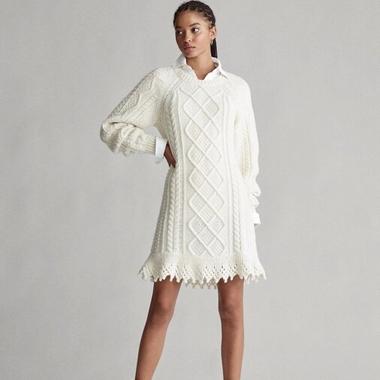 Robe-pull en tricot d’Aran, Ralph Lauren, 349 €. Disponible sur ralphlauren.fr.