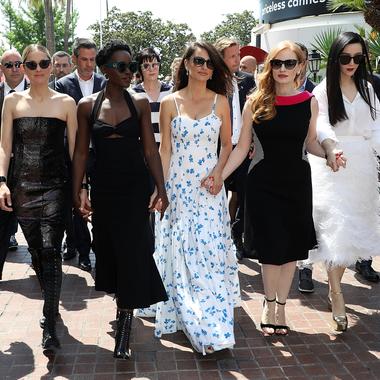En rang d’oignons, main dans la main, les cinq actrices sont venues chercher elles-mêmes le distributeur de leur prochain projet cinéma, 355. (De gauche à droite : Marion Cotillard, Lupita Nyong’o, Penélope Cruz, Jessica Chastain et Fan Bing Bing, Cannes, le 10 mai 2018.)