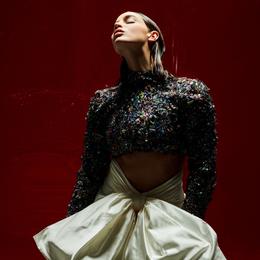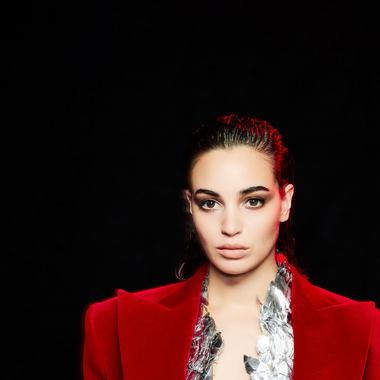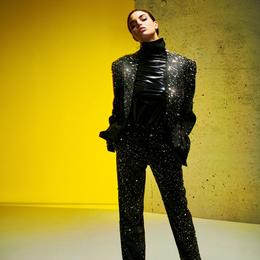 Veste texto en velours de soie, Alexandre Vauthier Haute Couture et top en soie plissée brodée de feuilles d’étain, Ronald Van der Kemp.