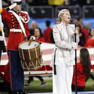 Ça n’est certainement pas une grippe qui empêchera Pink d’interpréter l’hymne national américain, en ensemble satiné avec imprimé camouflage et veste bomber à épaulettes. (Minneapolis, le 5 février 2018.)