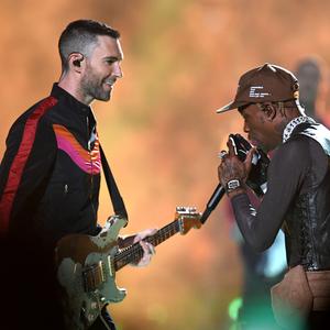 Adam Levine choisit la veste de survêt tandis que Travis Scott préfère le cuir sans oublier sa casquette Astroworld. Le tout pour un show aux dimensions rock et rap.