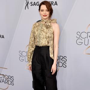 Emma Stone adopte le haut asymétrique doré, réalisé sur mesure par Louis Vuitton. (Los Angeles, le 27 janvier 2019.)