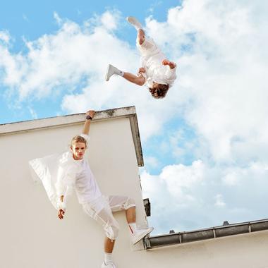 En subtil équilibre, matières techniques et nuances pop dessinent un vestiaire sportswear résolument choc. Un style de haut vol sublimé par trois stars du Parkour*, cette discipline urbaine qui consiste à grimper et bondir de murs en toits.