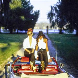 Christy Turlington et Naomi Campbell, cowgirls modernes sur leurs cadillacs dans un édito de Vogue. (1er février 1992.)