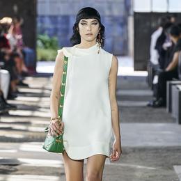 Sur les écrans d’ordinateurs, les prises de vue aériennes filmées par les drones donnent aussi à voir le dos des robes qui traînent comme des coups de pinceau sur le sol. C’est du pur Valentino, gracieux, aérien, majestueux, redéfini dans un nouvel esprit contemporain. Pour preuve, les blouses en mousseline de soie qui se portent avec un jean bootcut sorti des archives de Levi’s, avec qui Valentino collabore pour l’occasion, ou l’emblématique escarpin Rockstud qui ne dépasse pas le kitten heel et s’orne désormais de clous version macro. Une collection qui donne à voir l’essence et les sens d’une griffe sans revendication ni pesanteur exagéré. Un peu de magie suspendu dans le temps, tout simplement.